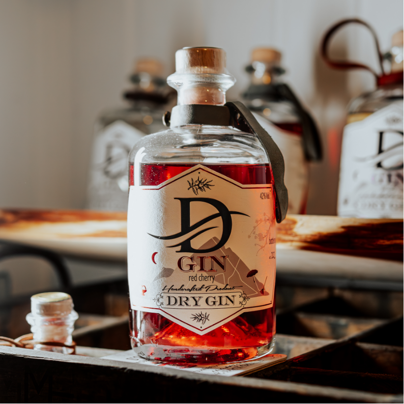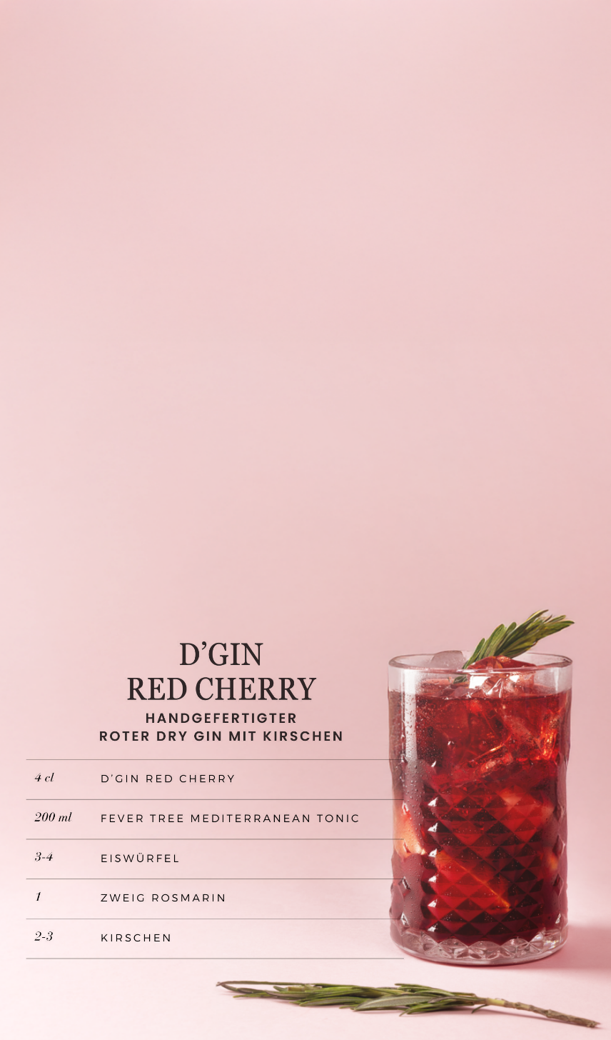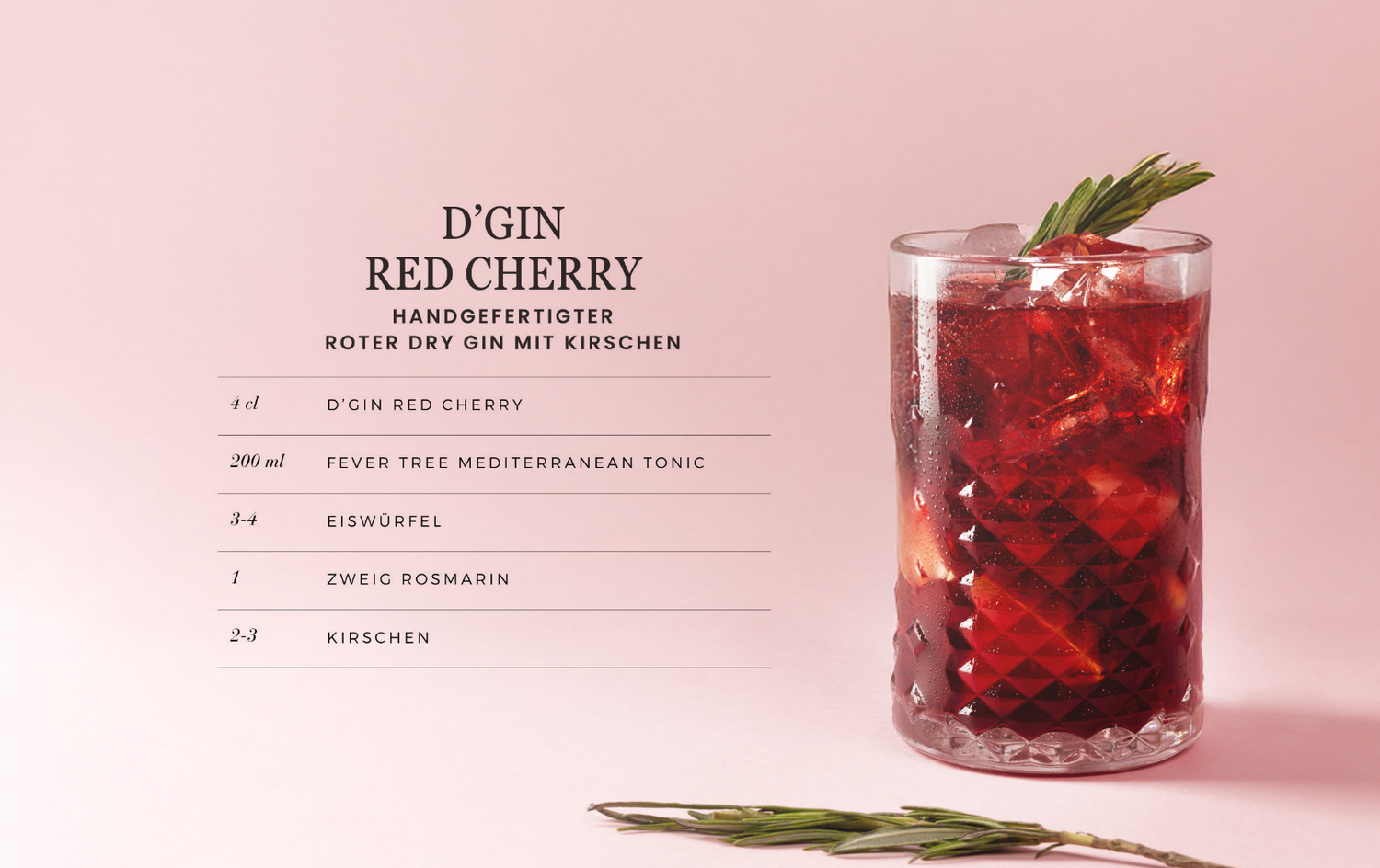 D’GIN Red Cherry kombiniert intensive Fruchtnoten heimischer Kirschen mit der herben Frische eines klassischen Dry Gins. Abgerundet mit mediterranem Tonic, Eiswürfeln, einem Zweig Rosmarin und ein paar frischen Kirschen wird daraus ein sommerlich-leichter Signature Drink – perfekt für laue Abende oder besondere Anlässe.